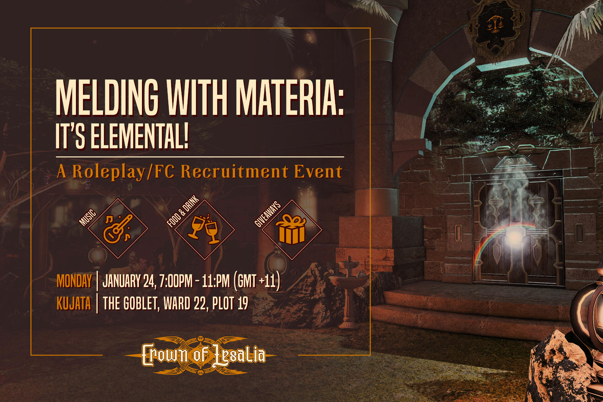 JANUARY | Melding with Materia: It's Elemental! | A small party held in the Rainbow Oasis in Kujata, doubling as a recruitment drive on the eve of the launch of the Materia DC. |