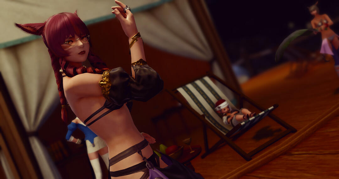 It was a lovely day for a hangout, The Lesalia had gathered at a bar in "The Forgotten Springs" that had been rented for the evening. Was a way for The Courtiers to relax, unwind, be social and share in some much-needed drink and revelry.Chant turned up a little while after it started ft that she needed to catch up, so she basically cornered A'yanthi into a drinking contest based on something Arndis quipped about. It didn't go well and before long, Chant passed out.Some moments went by and Arin picked her up off the floor taking her to get some water, checking on her and being sure she was ok. A'yanthi too, though tipsy helped out and a further moment on Chant wandered outside, stripped to her undergarments and day in the river to cool off.Happily soaking V'nyx came out to check on her and the two chatted for a bit, Chant was in a playful mood but it wasn't met with much input as whatever occurred with the argument inside had followed the snow coloured Miqo'te's mood. Chant struggled to cheer her up before A'yanthi came out to join them. Before they could settle, however, the town was hit by some sort of brief monster incursion. The girls lept up to lend a hand to the townsfolk. The battle was a rush but over in a few moments, catching their breath and being thanked by the guards, the girls returned to the river to resume their conversation.Now the three sat together discussing the situation and tensions inside, V'nyx looked frustrated so as she went inside to grab drinks for the girls, Chant proposed to A'yanthi that they take her to the actual spring. Upon V'nyx's return that's exactly what they did, Chant though decided she'd meet them thereafter she acquired a tray carrying a jug of orange juice and glasses to enjoy it with. As she arrived at the spring, she wanted to make a show of it and after placing the tray down, she excitedly leapt off the deck, landing hard and spraining her ankle. The tiny miqo shrugged it off the best she could, though in her mind making V'nyx happy was more important then her currently painful throbbing. As she made her effort to shrug it off, Arndis came over to join them, much to the agitation of V'nyx, but Chant being Chant welcomed her to join them along with A'yanthi. It was a long series of tense moments, Chant squeaked up and said that her ankle was actually now in a lot of pain (it was), V'nyx used the opportunity to seek out a first aid kit of some description.It didn't take her too long to return, A'yanthi helped Chant up the stairs, sat her down and let Nyx get to work. Chant was bandaged up well enough, but both A'yanthi and Chant were at a loss to how to cheer V'nyx up so Chant tried changing up the topic, at that point though V'nyx took her leave, A'yanthi helped Chant back to the building to dry off and rest and went about her way.