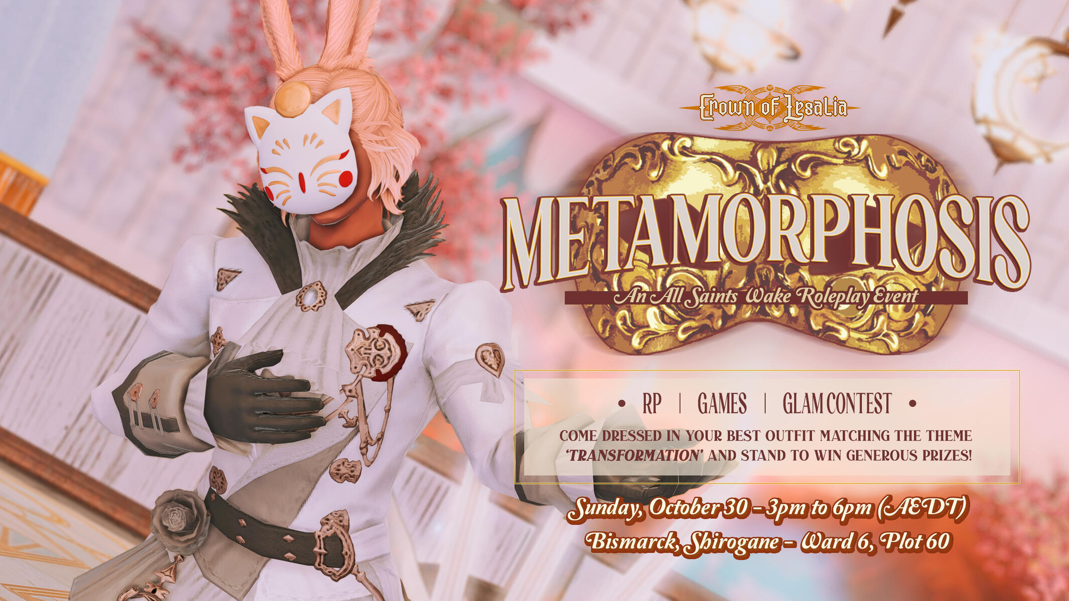 The Crown of Lesalia has decided to bring the delightful Eorzean tradition of All Saint's Wake to Hinganshi! Join the court on Sunday, October 30 from 3:00PM to 6:00PM (AEDT) for some revelry and mischief. Guests were invited to come dressed in costume and enjoy some fun games, refreshments, and great company. There were also party games to win fun little trinkets and prizes culminating in the Metamorphosis glamour contest.